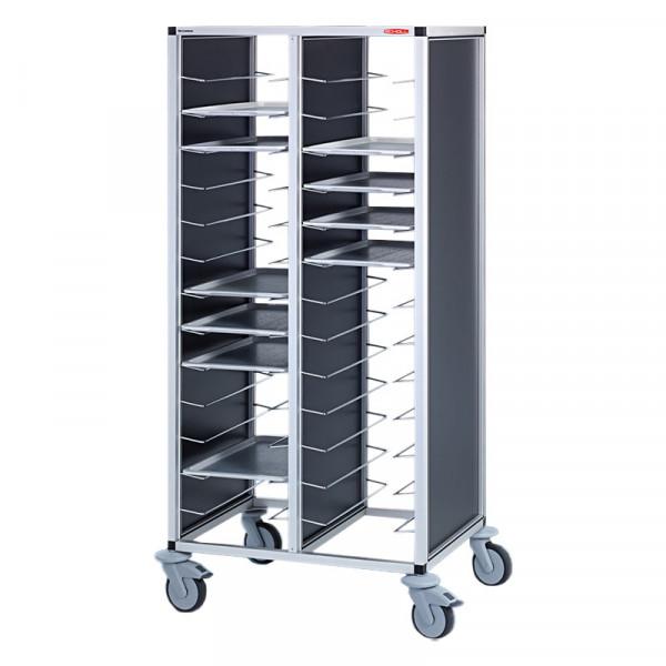 Rahmenkonstruktion aus silber eloxierten Spezial- Leichtmetall-Profilen. 2 Abteile, Seitenwände und Trennwand aus melamin- harzbeschichteten Platten. Tablettauflagen aus Edelstahl. Je Auflage kann 1 GN-Tablett der Größe 530 x 325 mm eingestellt werden. Höhenabstand zwischen den Auflagen 150 mm. Fassungsvermögen: 18 Tabletts. Fahrbar durch 4 korrosionsgeschützte, kugelgelagerte Lenkrollen, Durchmesser 125 mm, davon 2 mit Feststeller, einschließlich Wandabweiser.