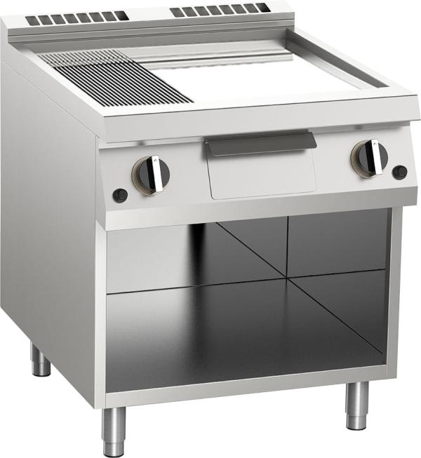 BTH 800 x 730 x 900 mm Platte 735 x 530 mm Gas 14,0 kW Mit 2 Heizzonen Grillfläche ⅔ glatt, ⅓ gerillt, verchromt 735x530 mm Gehäuse aus Edelstahl AISI 304 Mit geneigter Platte Oberplatte 40 mm abgesenkt und dicht verschweißt Mit 65 mm Kaltzone an der Plattenvorderseite Runde Fettablauföffnung Ø 40 mm und 2,5 l Fettauffangschale Beheizung durch Stahlbrenner Manuelle Temperaturregelung zwischen 110 und 280 °C Steuerung der Gaszufuhr über Sicherheitshahn, Thermoelement Gerät mit höhenverstellbaren Edelstahlfüßen Tiefe inklusive abgeschrägter Bedienblende 750 mm |