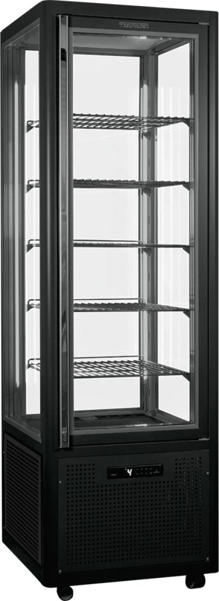 ) Hersteller/Großhändler KBS   BTH 595 x 640 x 1890 mm 5 höhenverstellbare Roste 450 x 420 mm 4°C bis 10^c 230 V, 0,44 kW, Umluft Kältemittel R 290 (Propan) GWP 3 Für die Präsentation von Kuchen 4-seitiger Glasaufbau Energiesparende 3-fach Isolierverglasung LED-Beleuchtung separat schaltbar Digitale Temperaturanzeige Elektronische Temperaturregelung Automatische Abtauung und Tauwasserverdunstung Luftfeuchte 75 % Rasterleisten zur Höhenverstellung der Ablagen Robuste Griffleiste aus Edelstahl über die gesamte Türhöhe Türanschlag rechts Werkseitig mit Türanschlag links lieferbar Robuster Türgriff 4 Rollen für leichte Mobilität, davon 2 mit Feststellbremse |