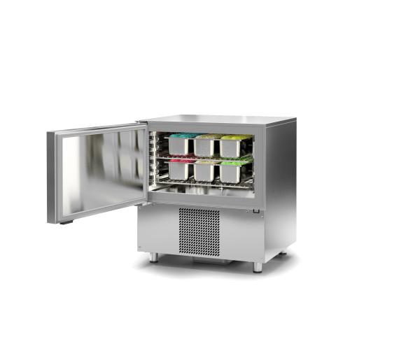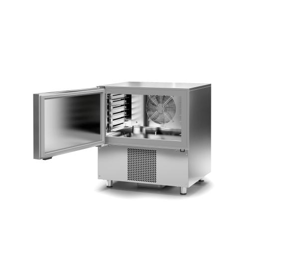 BTH 760 x 700 x 830 mm Schnellkühlleistung pro Zyklus 15 kg (65°C bis 3°C) in 90 Min. Schnellfrostleistung pro Zyklus 10 kg (65°C bis -18°C) in 240 Min. Anschlusswert 230 V - 450 W Kältemittel R452A Kälteleistung 1.357 W -10°C VT 541 W -30°C VT Alle funktionellen Anforderungen werden durch dieses leistungsfähige Kombigerät in der Küche erfüllt. Durch das Schnellkühl- bzw. Schockfrost-Verfahren eröffnen sich in allen Speisenbereichen neue Möglichkeiten sei es in der Vorbereitung, in der Konservierung oder der Erhalt der Garfrische. Der Korpus ist innen und außen aus einem pflegeleichtem PET Gehäuse mit Antifingerprint Schutzbeschichtung (Silver-Ice) Material ausgestattet. Der in Hygieneausführung gefertigte Innenkorpus verfügt über eine tiefgezogene Bodenwanne mit Ablauf. Die Stellagen sind für die Reinigung einfach herausnehmbar. Gerät geeignet für Aufnahme von 5 x GN1-1 oder 5 x EN4060. 5 Einschubpositionen, 50 mm Abstand zwischen den Einschubpositionen. Zubehör: Kerntemperaturfühler Das Steckerfertige Gerät hat eine digitale Touch-Steuerung mit einer individuell programmierbaren Temperatur und Zeiteinstellung. Der beschichtete Hochleistungs-Lamellen-Verdampfer ist korrosionsgeschützt und bietet zusätzlich noch eine intelligente Luftführung für optimale Kühl- und Schockfrost-Ergebnisse. Die runden CNS-Füße sind höhenverstellbar. |