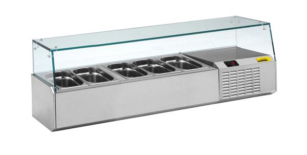 BTH 1330 x 324 x 387 mm außen BTH 815 x 243 x 150 mm innen Anschlussart:steckerfertig Kühlungsart (Produkt):statische Kühlung Kältemittel:R-290 Kälteleistung:237 W | -10 °C (VT) Kältemittel Füllmenge:50 g Bruttoinhalt:33 l Aufnahme (wahlweise):5 x GN 1-4-150 Steuerung:elektronische Steuerung Temperaturbereich:2 bis 8 °C bei 30 °C UT und 55 % RF Klimaklasse:4 (+30 °C UT und 55 % RF) Isolierung:PUR-Hartschaum in mm: bis zu 42 Verkleidung außen:CNS 1.4301 / Edelstahl 1.4509 Verkleidung innen:CNS 1.4301 / CHR 1.4509 Bruttogewicht:75 kg Nettogewicht:46 kg Anschlusswert Elektro:0,14 kW | 230 V | 1 | 50 Hz Absicherung:1,2 A Energieverbrauch:2,25 kWh/24h Energieverbrauch:821 kWh/annum Produktionsschritt:Vorbereiten für GN 1/4-150 Glasaufsatz, 3-seitig geschlossen Frontbelüftung elektronische Steuerung Digitalanzeige, Touch-Pad automatische Abtauung (auch manuell steuerbar) |